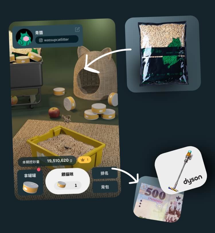 另外每天登入完成每日任務也能夠額外取得罐罐,餵食越多罐罐給貓咪的挖友,可以挖到越多的貓砂,累積您的「挖砂量」。而每位挖友每個月都會出貨一次,在出貨日當天,有安排出貨的挖友們都可以藉由您的「挖砂量」參與當日的排名,挖砂量越高的挖友將可以獲得排名獎勵(獎勵內容每日皆不同,有機會怒折新台幣五百元,用銅板價帶走貓砂,另外特別節日有可能會出現優質大禮👀)。