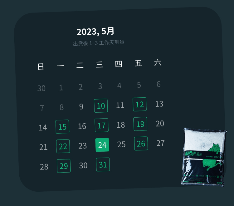 訂閱貓砂後我們將每月為你出貨並可以選擇出貨日期,挖砂貓砂每週一、三、五出貨,約一到三個工作天可到貨。